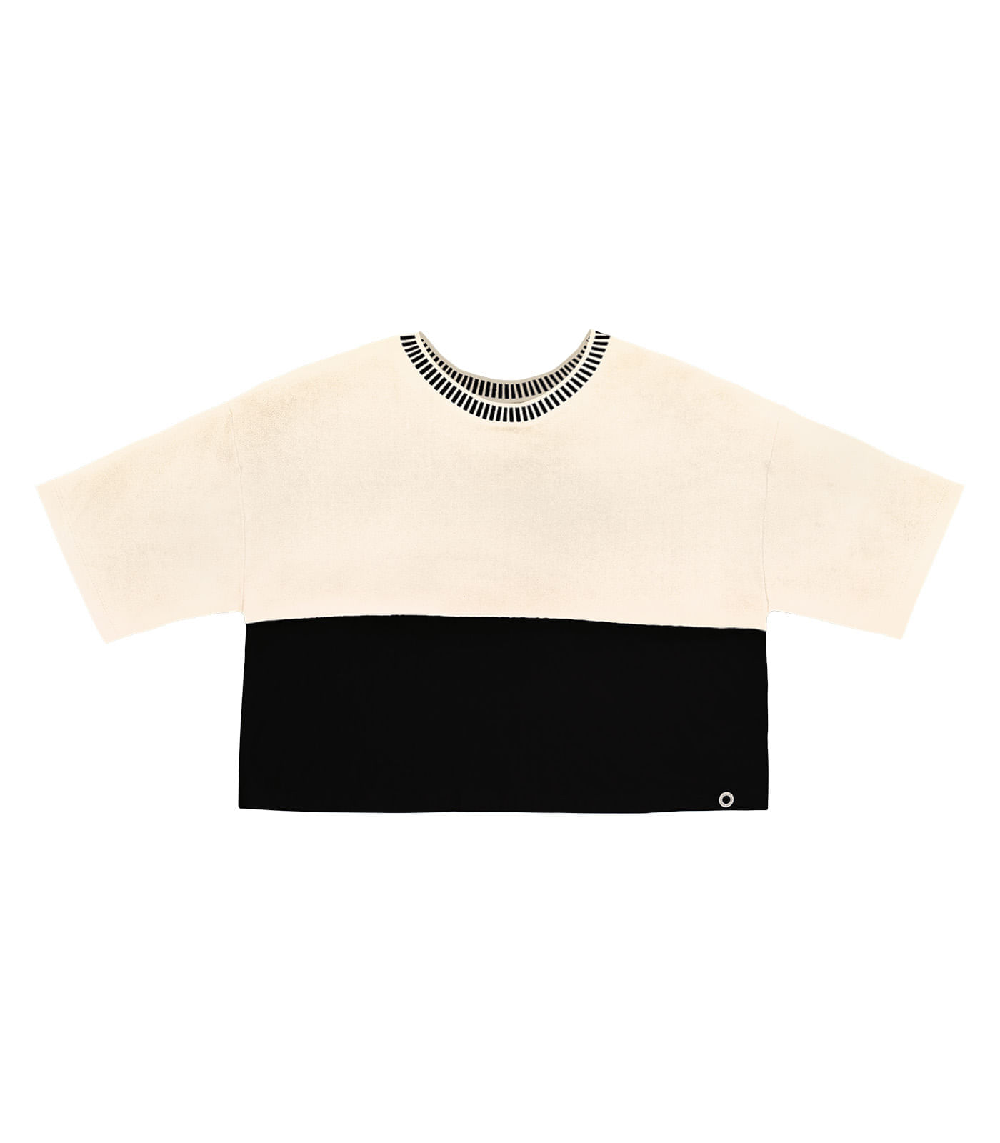 Detalhes Adicionais: Recorte em duas cores (bege na parte superior e preta na parte inferior), detalhe em retilínea no decote com listras preto e branco, pequeno detalhe circular decorativo na parte inferior direita
