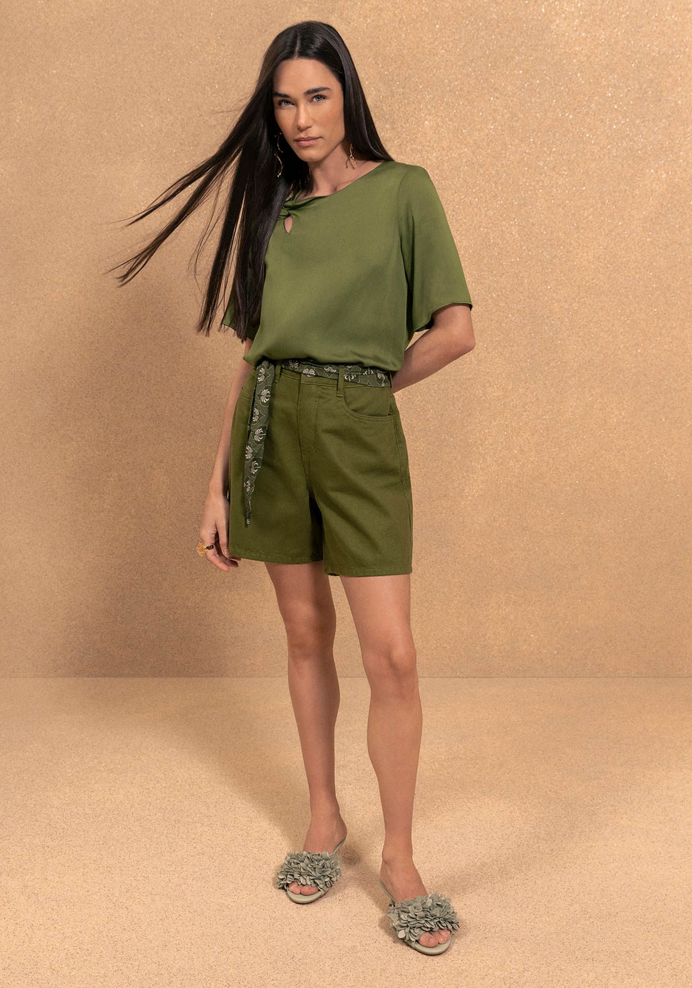A blusa fluida manga curta com recorte lateral torção em verde oliva é a escolha perfeita para quem busca conforto aliado a um design moderno e sofisticado. Confeccionada em viscose responsável, ela oferece um toque macio e um leve brilho que valorizam o caimento fluido e solto da peça. Seu decote redondo e a modelagem solta garantem liberdade de movimento e frescor, ideal para o dia a dia ou ocasiões casuais com um toque de elegância. O detalhe do recorte lateral com torção confere um visual diferenciado, tornando a blusa versátil para compor looks que transitam do trabalho ao lazer com facilidade.