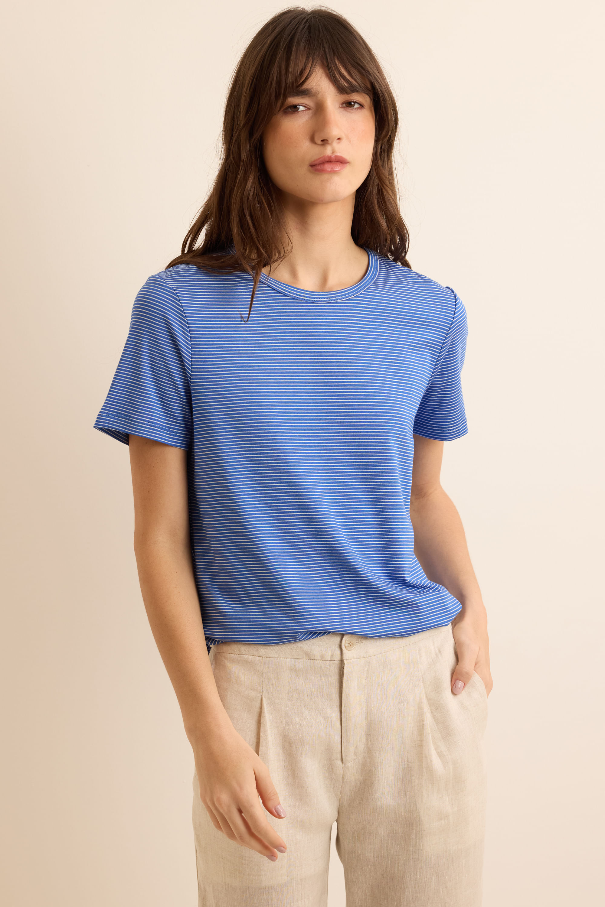 Detalhes Adicionais: Blusa de malha com listras sutis na cor azul, tecido leve e confortável com boa elasticidade, ideal para uso casual.