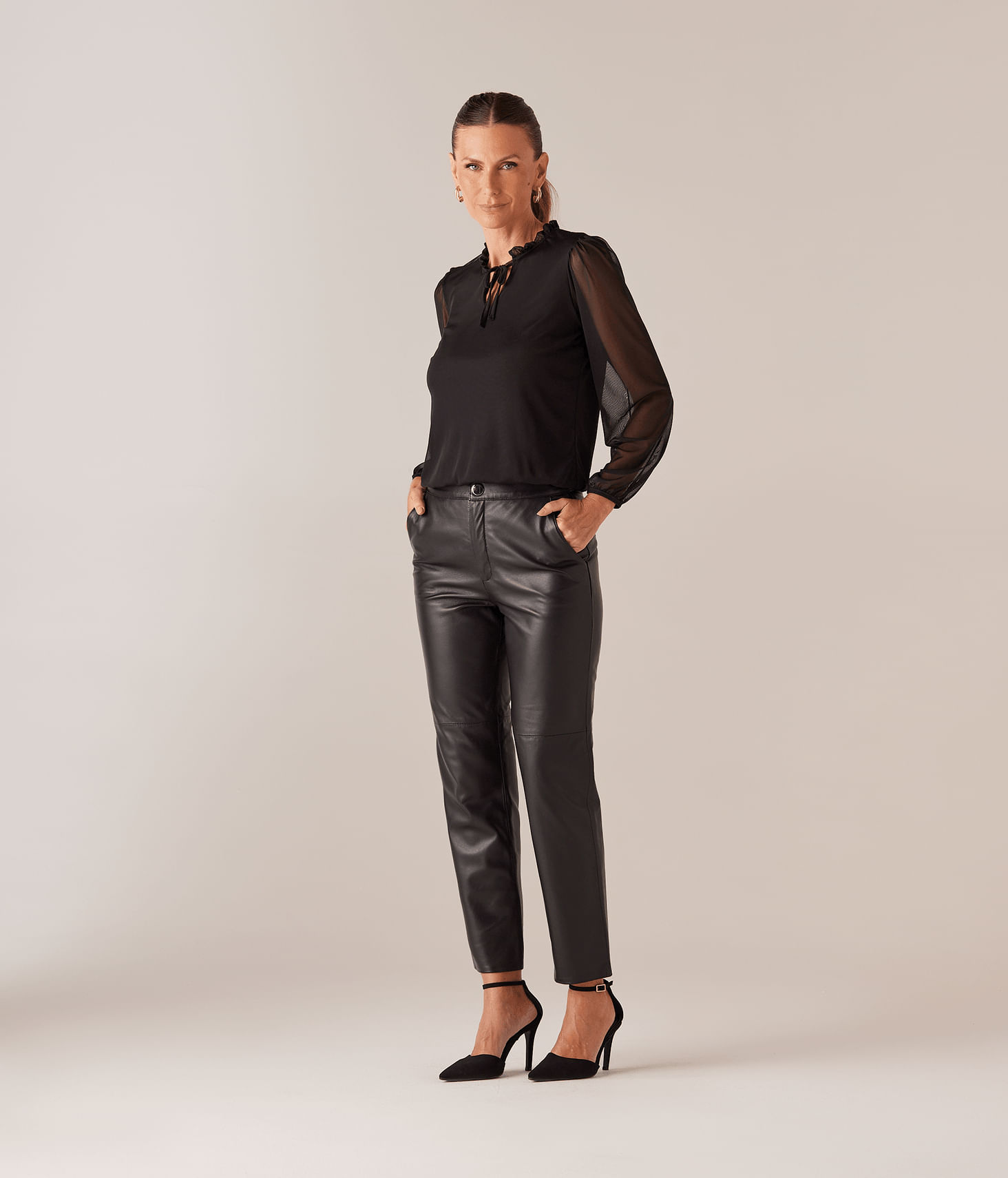 A Calça Cigarrete Couro Pelica Forrada Preta é sinônimo de elegância e conforto. Confeccionada em couro pelica 100%, oferece uma textura suave e flexível, garantindo durabilidade e um toque sofisticado. Seu corte cigarrete valoriza a silhueta feminina, enquanto o forro interno proporciona conforto térmico e ajuste perfeito ao corpo. Ideal para ocasiões casuais, essa peça une funcionalidade e estilo, sendo perfeita para quem busca um visual moderno e refinado no dia a dia ou em eventos informais. A cintura média e o comprimento longo complementam o design tradicional da barra, tornando a calça versátil e fácil de combinar.