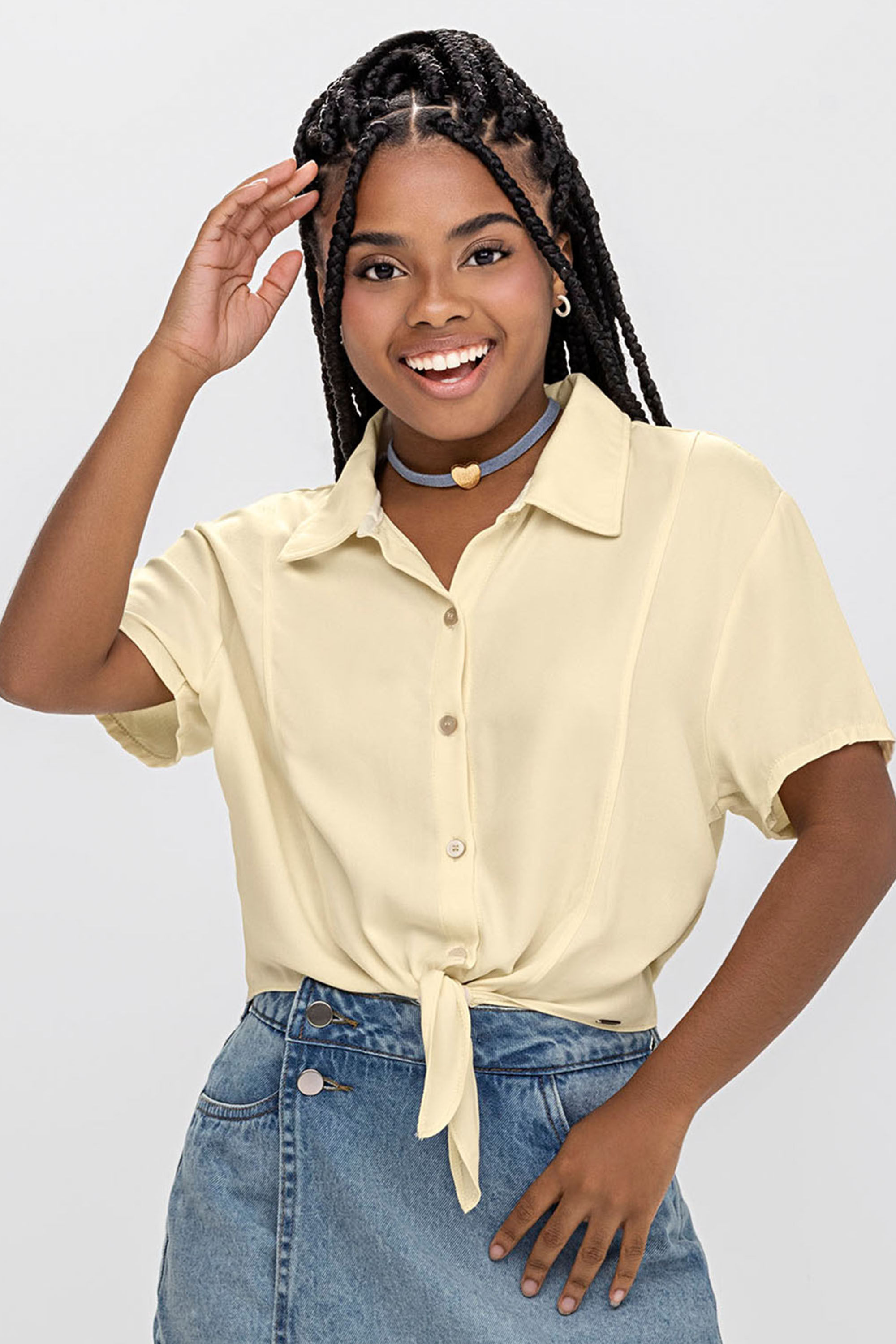 Camisa cropped juvenil em 100% viscose sarjada, com caimento leve e toque macio que privilegia conforto e respirabilidade. A modelagem regular garante liberdade de movimento, enquanto o comprimento cropped e a amarração na barra adicionam personalidade e permitem ajuste ao corpo. Gola polo com colarinho e fechamento por botões oferecem praticidade e um visual alinhado, ideal para looks casuais, dia a dia e momentos de lazer. Mangas curtas e tecido não transparente tornam a peça versátil para climas quentes; a cor amarelo claro lisa facilita combinações com shorts e saias para um styling jovem e atual.