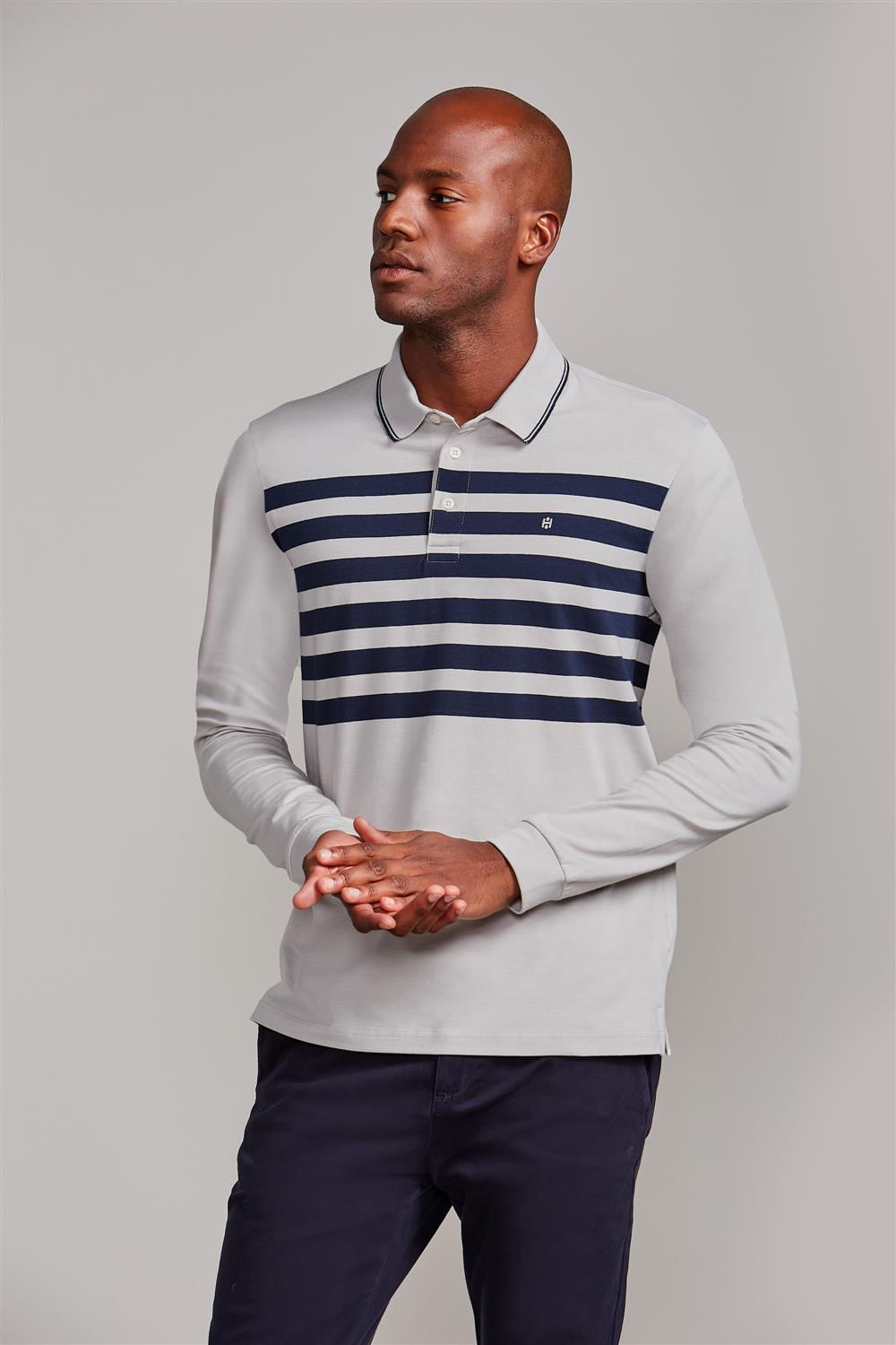 Detalhes Adicionais: Bolso falso; textura lisa; listras horizontais em azul marinho na região do peito; logotipo bordado azul marinho no lado esquerdo do peito; colarinho clássico com linha azul marinho na borda