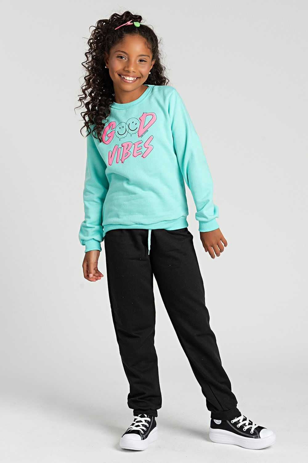 O Conjunto Infantil Acqua de Moletom Good Vibes é a escolha perfeita para garantir conforto e estilo às meninas durante os dias mais frios. Confeccionado em 100% algodão, oferece uma textura macia e aconchegante, ideal para a pele delicada das crianças. Seu design básico e funcional, com cor preta versátil e estampa frontal discreta, facilita a combinação com outras peças, tornando-o prático para o uso diário. O cós elástico com cordão ajustável e os punhos nas pernas proporcionam um ajuste seguro e confortável, além de ajudar a manter o calor corporal. Indicado para ocasiões casuais, lazer e atividades do dia a dia no inverno, este conjunto alia durabilidade e funcionalidade com uma estética simples e moderna.