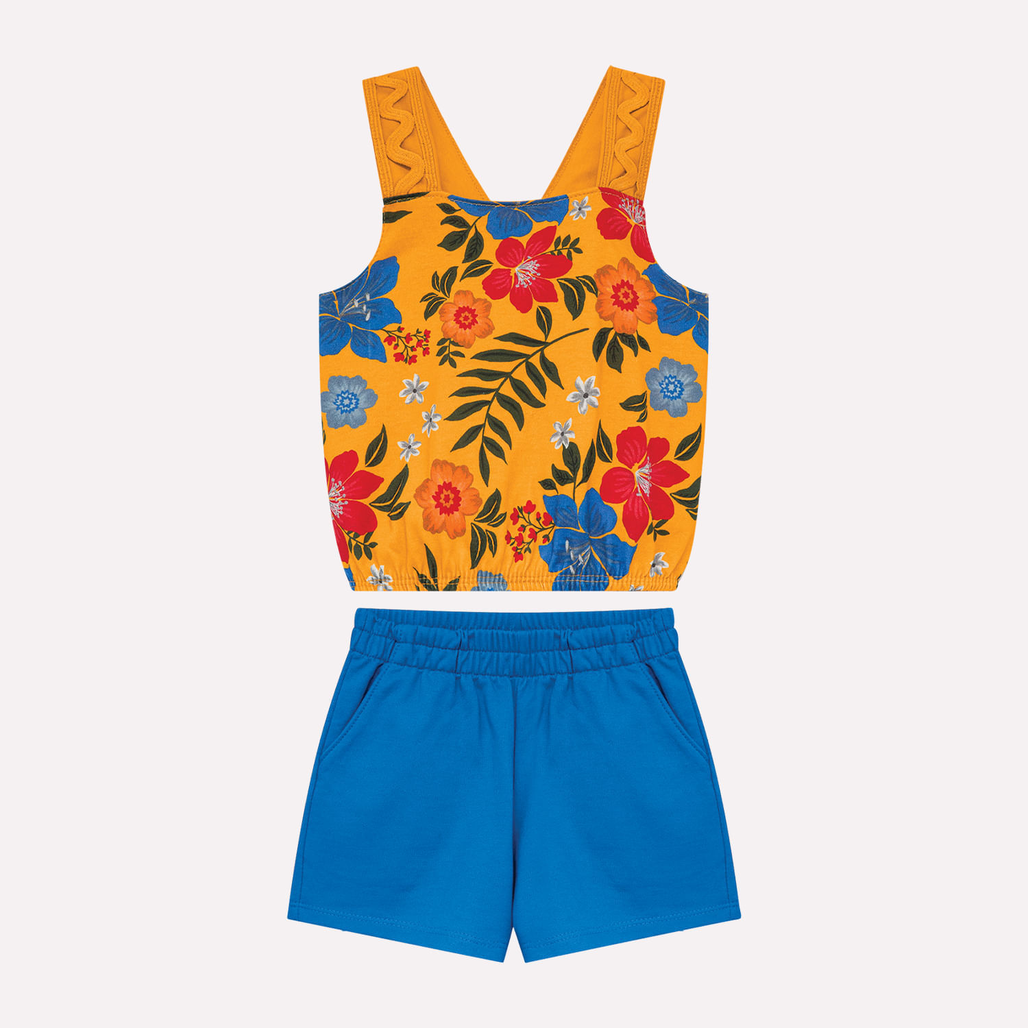 O conjunto infantil Nanai é sinônimo de conforto e estilo para as pequenas. Confeccionado inteiramente em algodão, a blusa cropped em meia malha oferece maciez e frescor, enquanto o short em moletinho proporciona praticidade e liberdade de movimento com sua modelagem soltinha. As alças em fita e o elástico rebatido na barra da blusa garantem um ajuste confortável e delicado, complementados pela estampa floral vibrante que traz alegria e charme ao visual. Ideal para ocasiões casuais, como passeios e encontros em família, este conjunto une funcionalidade e estética em uma peça versátil para o dia a dia das crianças.