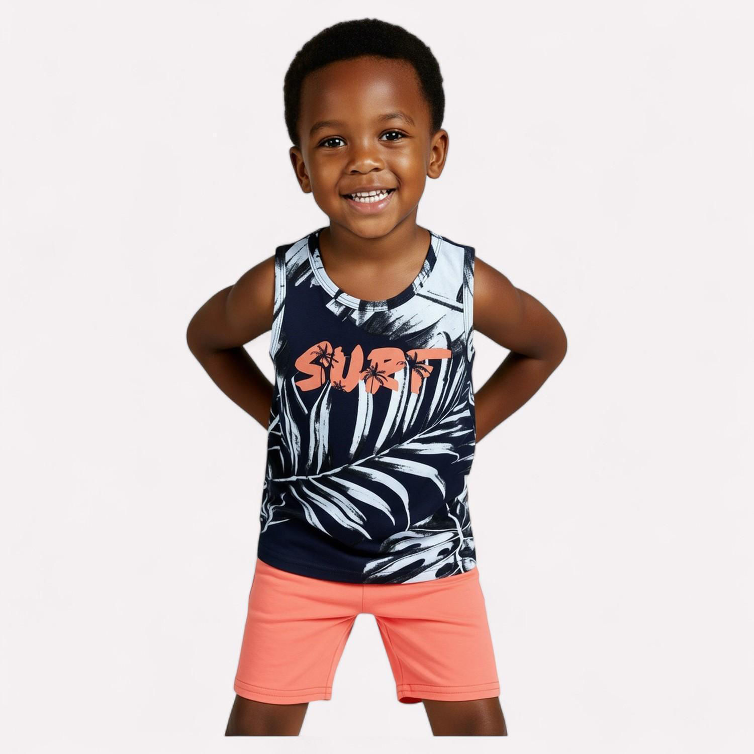 O Conjunto Infantil Menino Lettering Kyly é a escolha perfeita para os pequenos que buscam conforto e estilo nos dias mais quentes. Composto por uma regata em meia malha 100% algodão, a peça garante frescor e liberdade de movimento graças ao seu design sem mangas e tecido leve. A bermuda em moletinho sem felpa, também 100% algodão, oferece toque macio e ajuste prático com cós elástico, ideal para brincadeiras e passeios ao ar livre. A estampa rotativa com lettering surf confere um visual moderno e descolado, tornando o conjunto versátil para o dia a dia durante a primavera e verão.