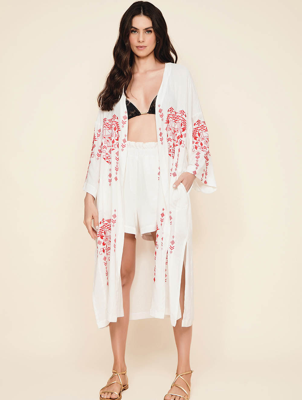 Este kimono bordado em linho longo é a escolha perfeita para quem busca elegância aliada ao conforto. Sua modelagem ampla e caimento fluido garantem liberdade de movimento e um visual sofisticado, ideal para ocasiões de lazer, como saída de praia ou momentos à beira da piscina. O tecido de linho oferece leveza e durabilidade, enquanto os bordados em cor contrastante adicionam um toque de charme e exclusividade à peça. Os bolsos laterais combinam funcionalidade com estilo, tornando o kimono prático sem perder a delicadeza. A cor branca e a estampa lisa conferem versatilidade, facilitando a combinação com diferentes looks de verão.