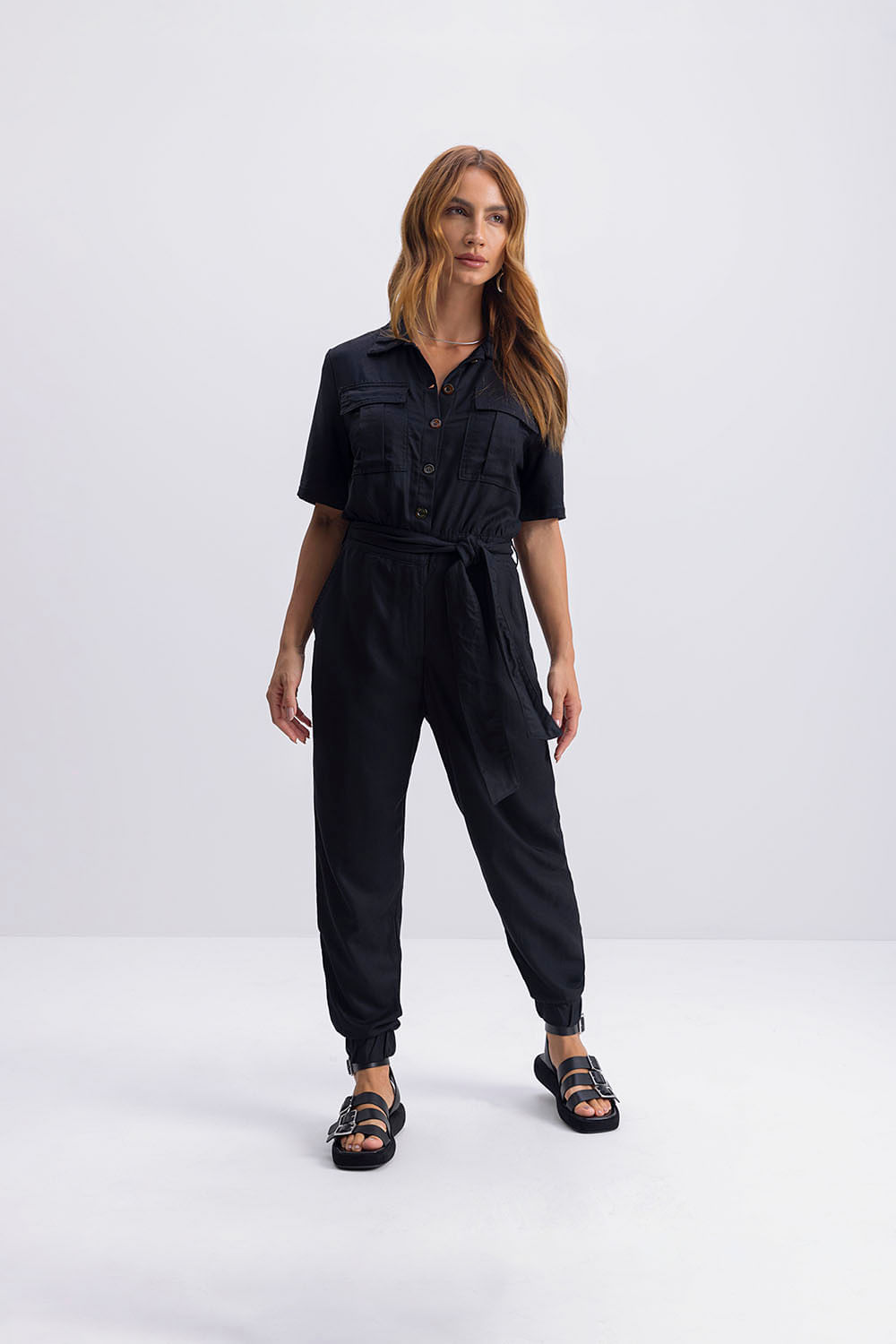 Este macacão feminino jogger Essendi é a combinação perfeita entre elegância e funcionalidade. Confeccionado em tecido com linho, oferece um caimento suave e respirável, garantindo conforto durante todo o dia. A modelagem jogger com elástico na barra valoriza a silhueta feminina, enquanto a abertura frontal com botões estilo tartaruga adiciona um toque sofisticado ao visual. Com mangas curtas e bolsos frontais, a peça alia praticidade e estilo, ideal para ocasiões que vão do casual ao formal. Seu design moderno e acabamento refinado fazem deste macacão uma escolha versátil para quem busca conforto sem abrir mão da elegância.