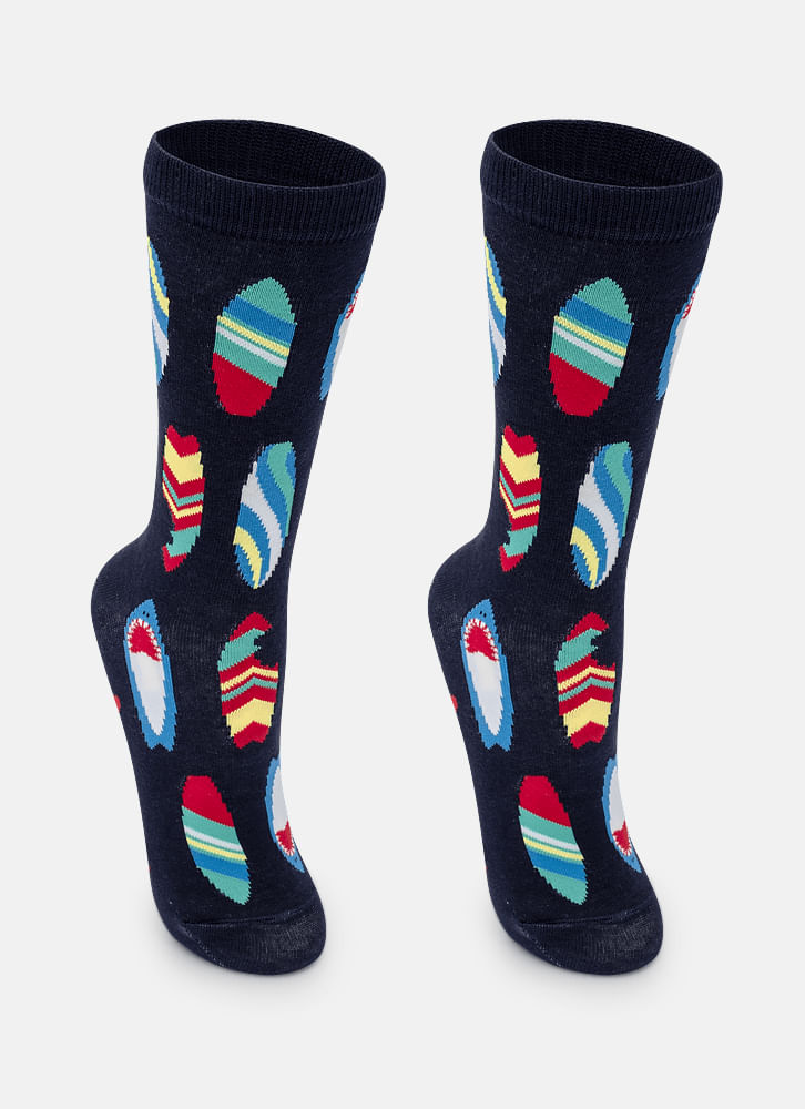 Meia cano longo com cano na metade da canela, confeccionada em algodão macio com detalhe em poliamida que traz o tema tubarão de forma moderna e divertida. Oferece conforto diário, toque agradável e bom ajuste ao pé; o cano mais alto protege e mantém a meia no lugar durante o uso. Estética jovem e versátil na cor azul marinho, ideal para combinações casuais e para uso com calçados fechados — perfeita para escola, passeio e rotina diária. Para preservar a cor e a durabilidade, siga as instruções de lavagem e conservação indicadas na etiqueta.