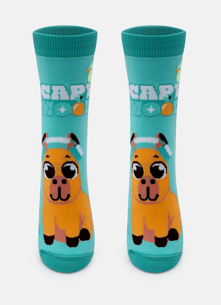 Qualidade da meia soquete: Confeccionada majoritariamente em algodão, proporciona toque macio e conforto durante o uso; a presença de poliamida na estampa agrega resistência e definição ao desenho. O cano médio garante ajuste firme em calçados fechados, tornando-a ideal para o dia a dia, escola e momentos de lazer. A estampa divertida de capivara e a cor turquesa dão personalidade ao look sem abrir mão da versatilidade e durabilidade.
