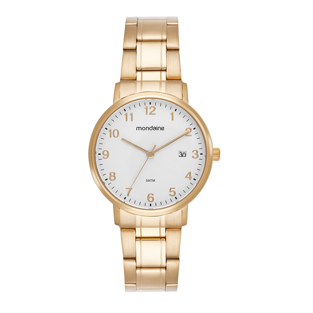 Este relógio feminino Mondaine é a perfeita combinação entre elegância e funcionalidade. Com caixa metálica redonda de 36 mm e acabamento dourado, ele exala sofisticação e estilo social, ideal para mulheres que valorizam um acessório clássico e atemporal. O mostrador prata com detalhes dourados, números e índices completos garantem uma leitura clara e refinada, enquanto o mecanismo analógico com calendário oferece praticidade para o dia a dia. A pulseira em aço inox dourado, com fecho de fivela, proporciona conforto e durabilidade, além de um toque de modernidade ao design vintage do relógio.