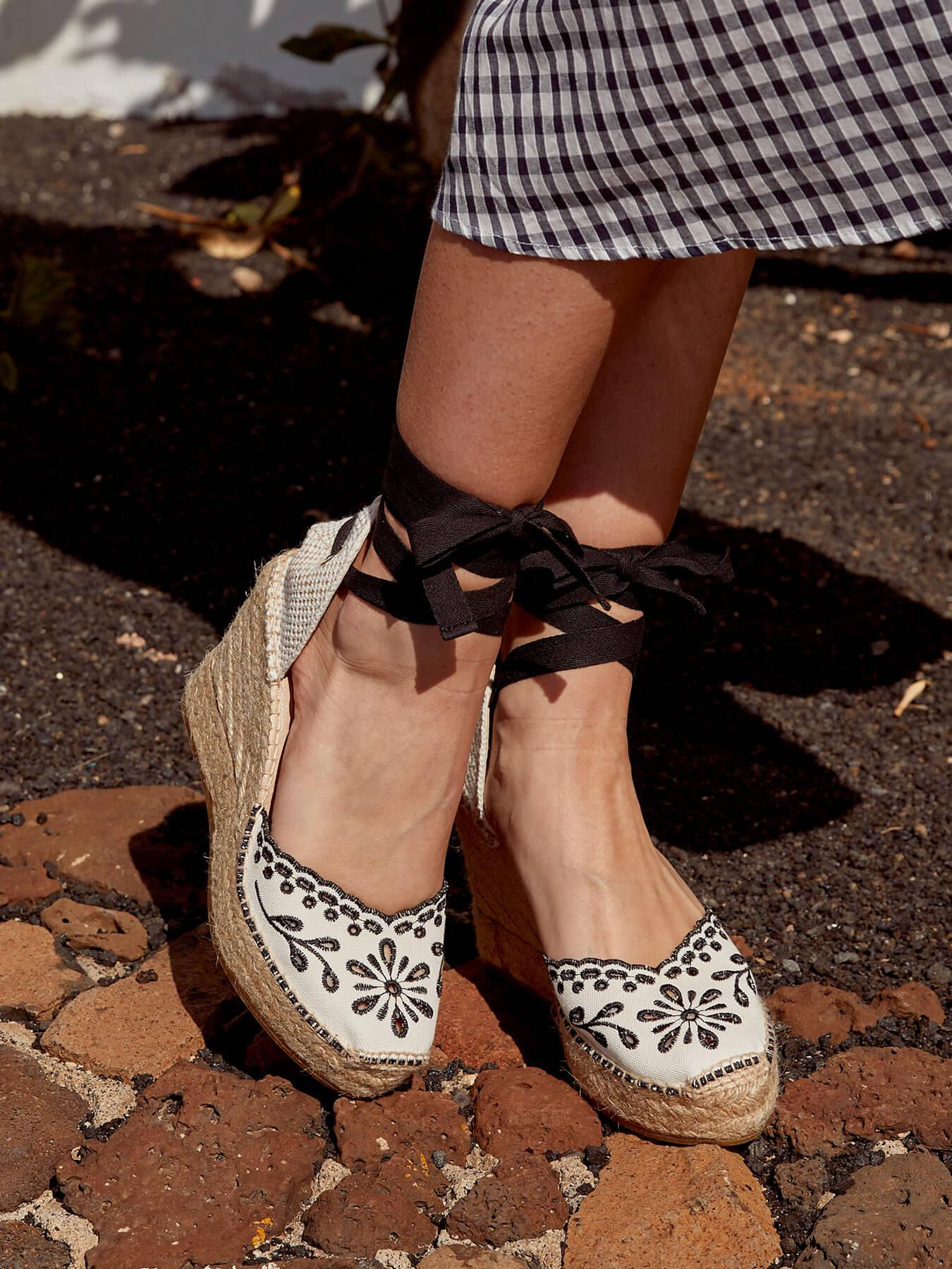 Sandália Anabela Alta Romero Tecido Bordado Preto REF: 8435661050989
