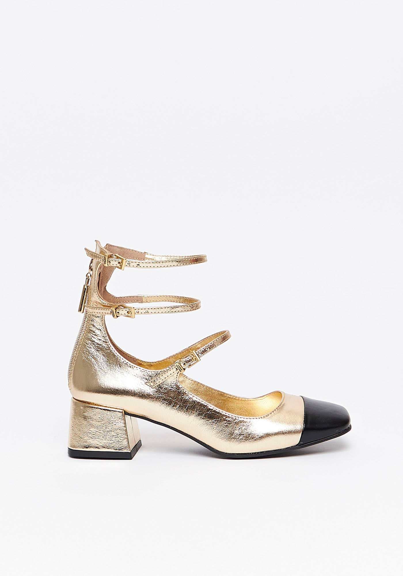 Detalhes Decorativos: Três tiras triplas com regulagem e fivelas douradas, biqueira preta contrastante