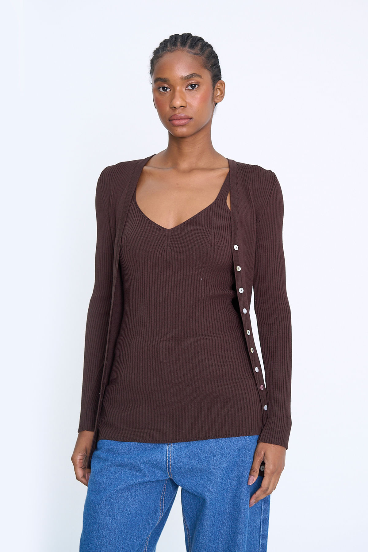 Detalhes Adicionais: Conjunto twin set composto por regata com alças largas fixas e cardigan com fechamento frontal em botões caseados, ambos em tricot canelado na cor marrom, modelagem reta e shape ajustado.