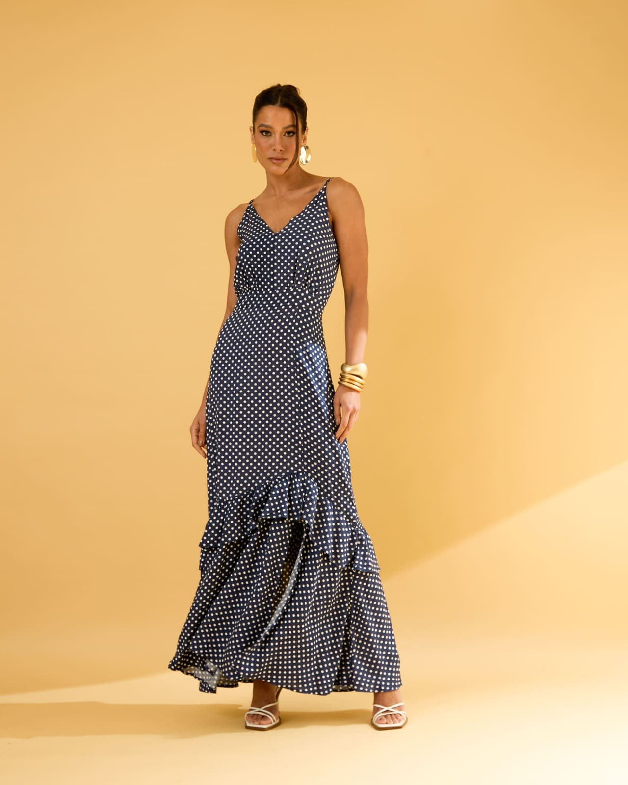 Estilo do Vestido: Solto com caimento fluido e babado