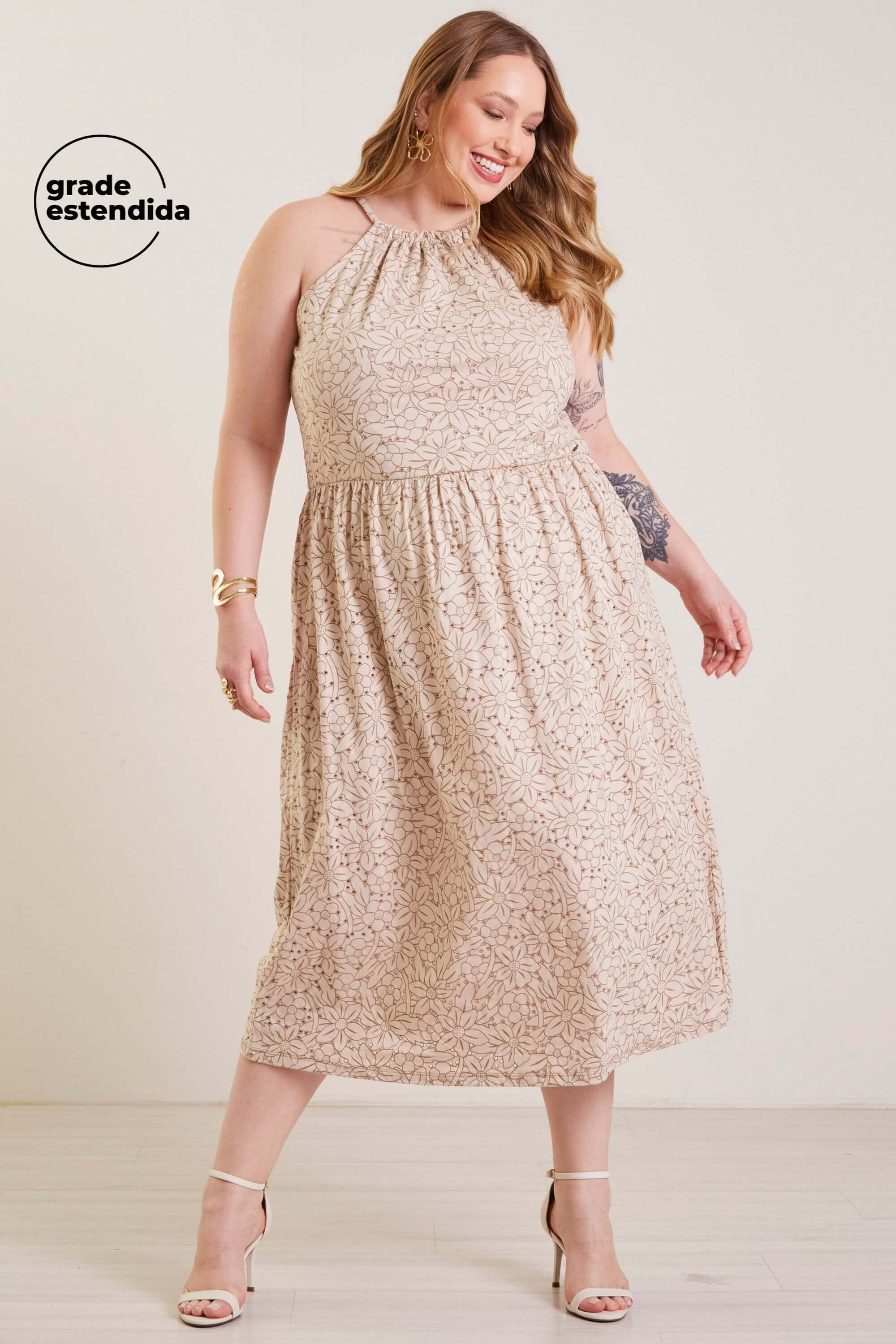 O Vestido Feminino Marialícia Midi Devorê é uma peça que une conforto e elegância com sua malha de algodão devorê, que combina leveza e toque suave ao corpo. Seu design solto com alças de amarração ajustáveis e detalhe nas costas proporciona um caimento perfeito e liberdade de movimento, ideal para os dias mais quentes. A estampa floral delicada e o tom bege conferem um visual sofisticado e versátil, perfeito para ocasiões casuais como passeios no parque ou eventos informais. Sem mangas e com decote em V, o vestido valoriza a silhueta com sutileza, enquanto o comprimento midi adiciona um toque de modernidade e charme.