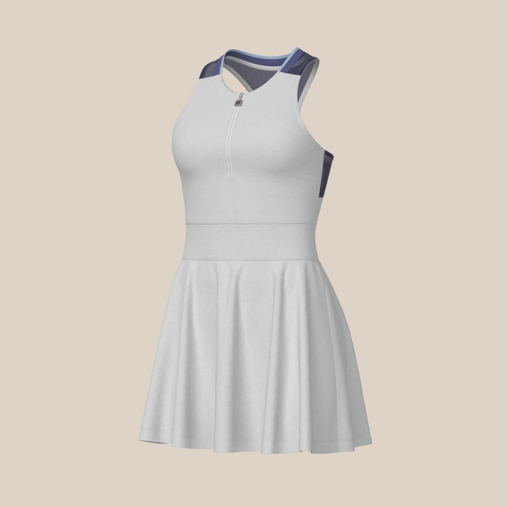 O Vestido FILA Match AO Feminino Sem Manga Branco une elegância e funcionalidade em uma peça de alta qualidade. Sua modelagem slim com saia evasê valoriza a silhueta, enquanto o tecido em poliamida e elastano oferece conforto e excelente caimento. Ideal para ocasiões casuais e uso diário, o vestido proporciona respirabilidade graças à tecnologia FLOW e proteção solar FPS 50+, tornando-o perfeito para ambientes externos. O design com gola retilínea e zíper frontal facilita o ajuste, e o decote em V aliado às costas nadador garantem liberdade de movimento e estilo moderno. Os recortes estratégicos modelam o corpo com sofisticação, e o logo F-Box nas costas adiciona um toque contemporâneo à peça.
