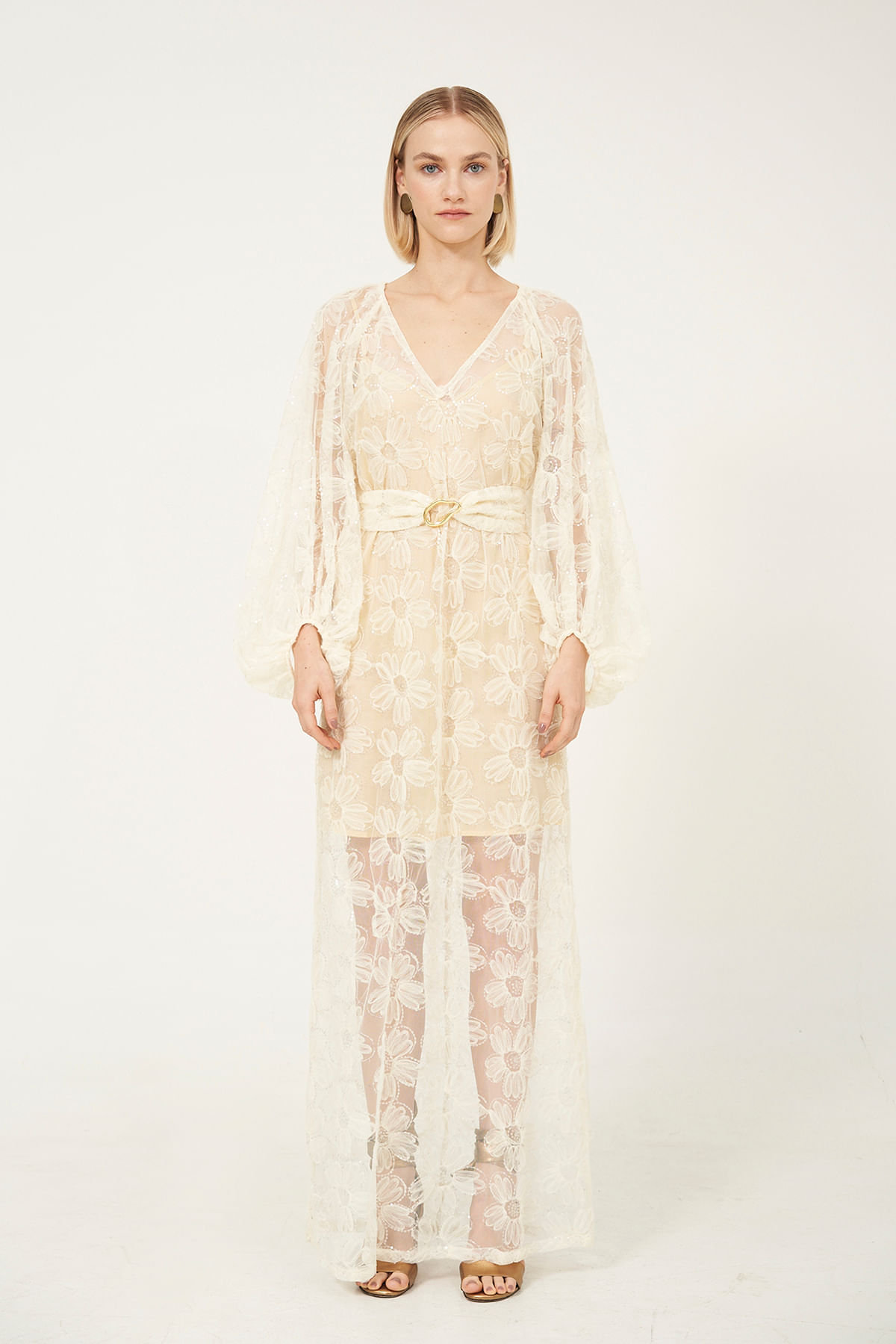 O Vestido Fuji Linnen Tule Com Aplicações Manga Longa Bege Claro é uma peça sofisticada que une delicadeza e elegância. Confeccionado em tule com composição de poliamida e elastano, oferece conforto e leveza, além de garantir boa durabilidade e elasticidade. Seu design reto com decote em V valoriza a silhueta, enquanto as mangas longas proporcionam um toque de refinamento. As aplicações florais em tecido com paetês adicionam brilho sutil e charme, tornando-o ideal para ocasiões especiais como eventos formais, festas e celebrações. O cinto no mesmo tecido com fivela permite ajuste personalizado na cintura, realçando a feminilidade da peça. O forro interno assegura conforto e opacidade, enquanto a ausência de fechamento facilita o vestir.