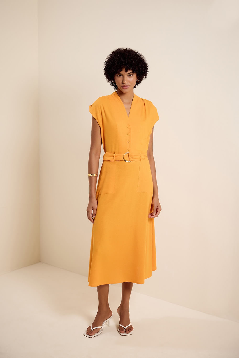 Vestido midi em tecido plano com viscose e linho que une caimento leve e toque fresco ao ajuste justo, valorizando a silhueta. O decote em V e a pala no ombro trazem sofisticação discreta, enquanto a ausência de mangas e o comprimento midi garantem conforto em dias quentes e versatilidade para looks casuais, trabalho informal ou passeios. Detalhes funcionais como bolso lateral, passador, faixa do próprio tecido e fechamento frontal por botão forrado aumentam a praticidade sem comprometer a estética; a cor Laranja Sunset oferece vibração e modernidade. Modelo veste tamanho 38.