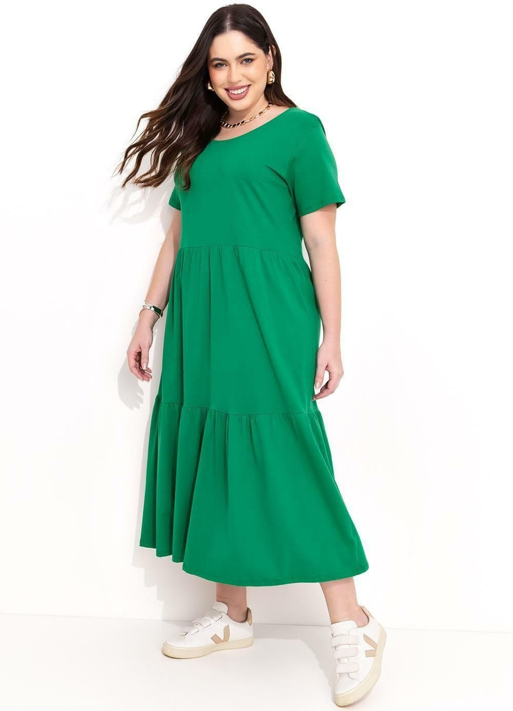 Vestido Meia Malha Babados Verde moderno traz o equilíbrio ideal entre estilo e conforto. O modelo é versátil e combina com diferentes momentos do dia. Vestido em malha de algodão. Decote redondo, mangas curtas e recortes franzidos no comprimento. Comprimento midi.
